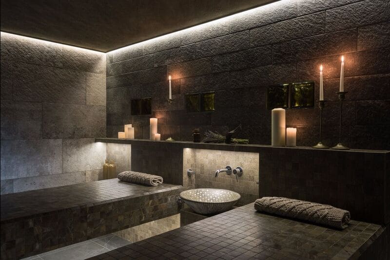 Оснащаем помещение термометрами-гигрометрами, чашами для подачи воды, чашей курны, плитами из гималайской соли и восточными светильниками.